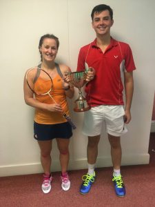 The mens’ and ladies’ singles were played on the Saturday using all twelve courts at times. In the mens’ singles Andrew Heinemann and Sam Lyle (both Surrey) met in the final with Andrew winning 21-12 21-13. The ladies singles final was a close three setter between youth in the form of Alexandra Oprisan (Surrey) and the experience of Caroline Westley (Essex) with Caroline eventually winning 18-21 21-9 21-19.