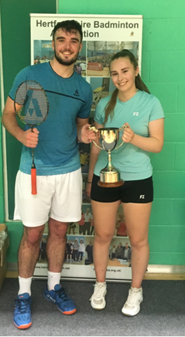 In the mens’ doubles the number one seeds Victor Liew and Robert Golding (Middlesex) dominated the event eventually beating Robin Harper and Ethan Van Leeuwen (Warks) 21-11 21-18 in the final. In the ladies’ doubles Hertfordshire’s Abbie Smith paired up with Jessica Allen (Leics) and met Annie and Natasha Lado (Hants) in the final where the Lados ran out the winners 21-15, 21-19. In the mixed doubles there was more Hertfordshire representation with Harry Goode and Olivia Clark pairing up with Caitlin Harper (Warks) and Jack Taylor (Norfolk) respectively. It was Harry and Caitlin that prevailed in a tight match winning 21-16, 12-21, 21-18.